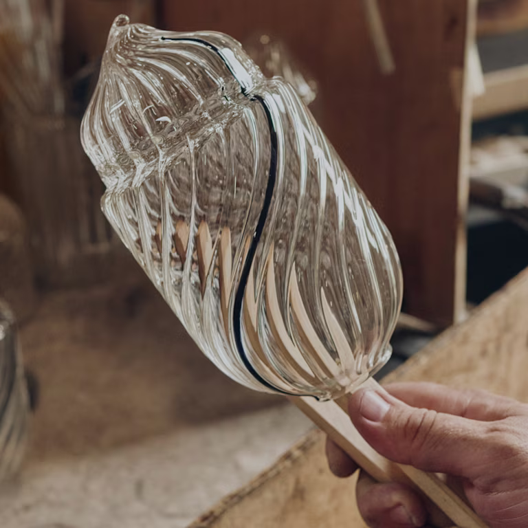 As if polishing a precious stone, the glassmaker patiently smooths the surface of the candle holder in the torch flame using tools made of raw glass or graphite. Before quality control, the object is fired a final time at 550 degrees to stabilise the borosilicate glass, heightening its transparency to the point of becoming nearly impalpable, all the better to magnify the wax and transform the candles’ fragrant flames into a thousand dancing reflections.